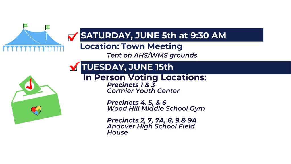 Every vote matters! If you cannot vote in person on June 15, please be sure to vote via absentee or mail-in ballot. More information on absentee and mail-in voting is available on the Andover Town Clerk website.