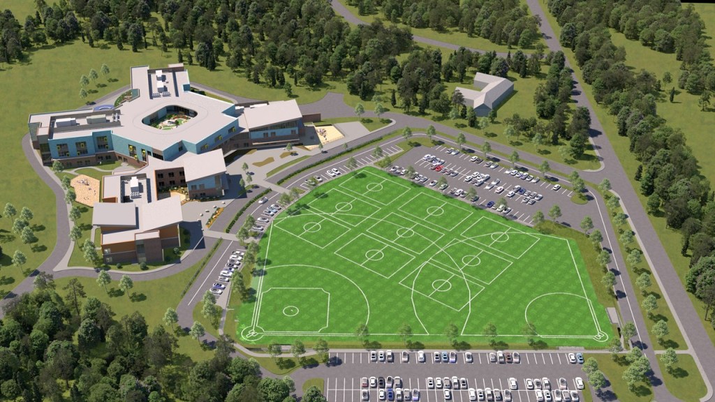 Architect’s rendering of fields in front of new West El/Shawsheen Preschool